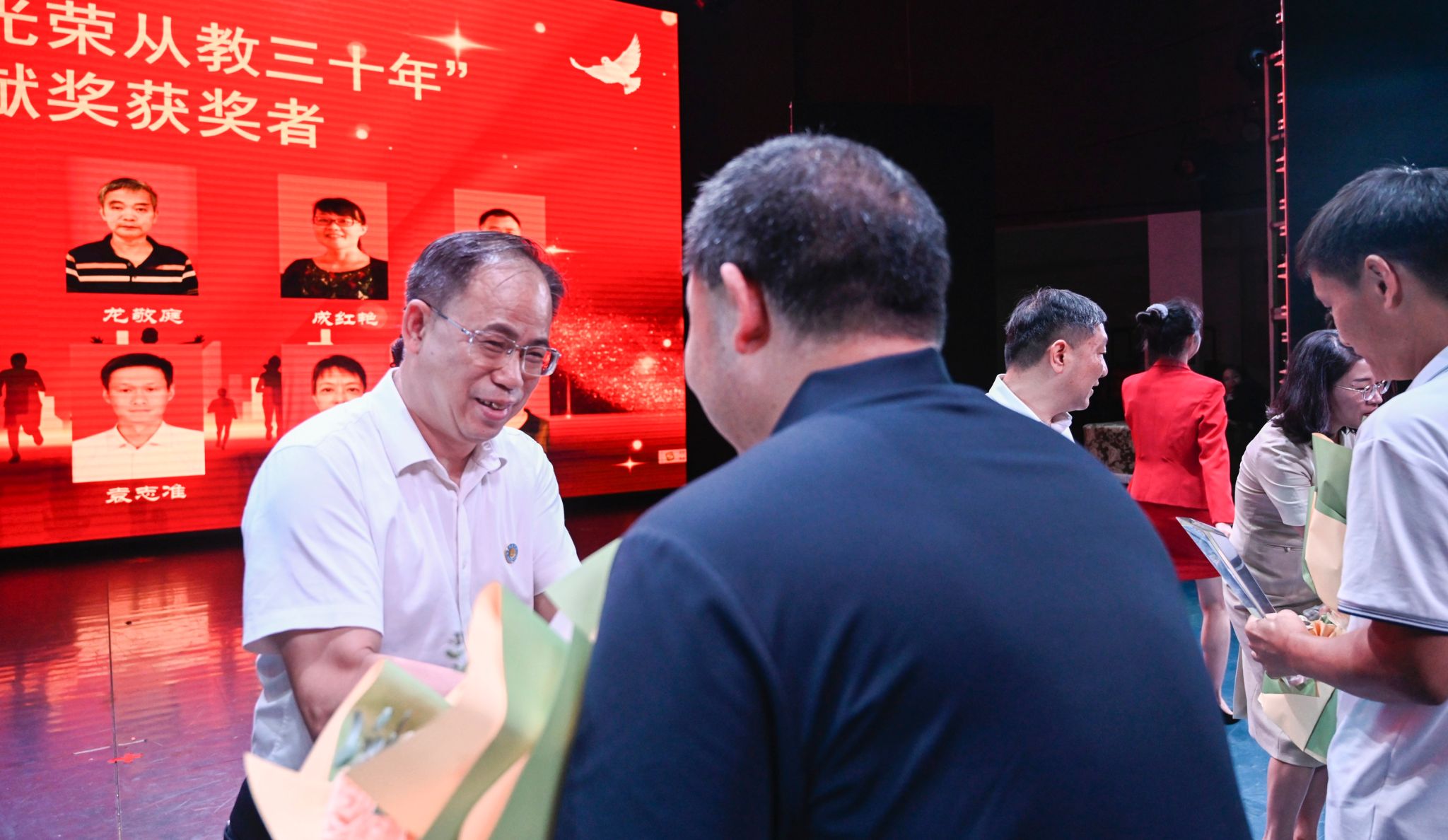 副校长谭献良先后宣读了《关于表彰2024年度单位目标管理考核先进集体及单项奖的决定》《关于表彰2025年师德先进个人的决定》《关于表彰火博电竞(中国)有限公司_官网第41个教师节先进人物(团队)的决定》。组织部等10个部门获评2024年度单位目标管理考核先进集体,纪委/监察专员办公室等10个部门获2024年度单位目标管理考核单项奖。张莉等15位教师获师德先进个人,习胜丰等10位教师获“光荣从教三十年”奉献奖,王林飞等10位教师获最美教师,王平等20位教师获优秀教师,王玮等10位教师获优秀教育工作者,理学院数学建模与数学竞赛教育“灯塔团队”获优秀教育工作团队。