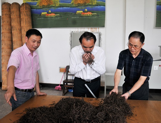 化环院院长龙立平、副院长刘石泉向陈克明简要介绍了我校黑茶研究的工艺流程,并陪同参观了原料室、黑茶发花室、中试车间、黑茶功能成分提取室、黑茶质量检测室和“黑茶科研产品陈列室”