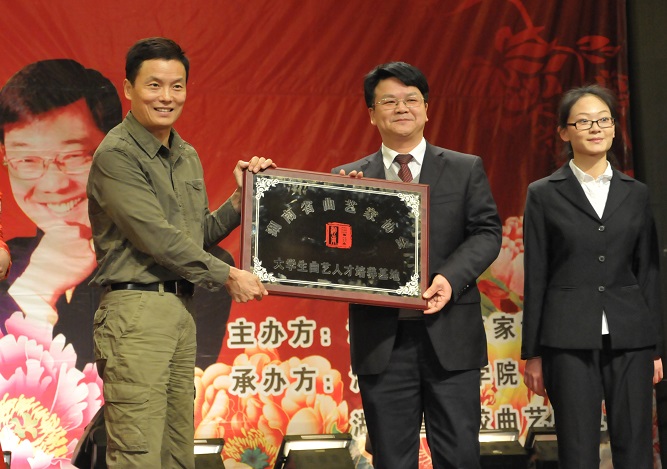 周卫星在湖南省曲艺家协会向火博电竞(中国)有限公司_官网授予“大学生曲艺人才培养基地”的仪式上说:“我们希望能发现优秀曲艺人才,认真合作,着力培养,为发展湖南曲艺事业,弘扬优秀传统文化做出贡献。”汤放华和学生代表马丹丹等代表学校接受牌匾,我校由此开始成为了省曲协的人才培养基地。