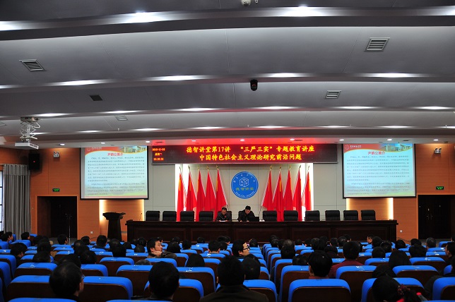 下午,学校德智讲堂第17讲在图书馆报告厅举行,中国社会科学院中国特色社会主义理论体系研究中心主任尹韵公研究员作了题为中国特色社会主义理论研究前沿问题的精彩报告,在家的校领导、全校副科以上干部、机关党总支全体党员、马克思主义学院全体教师参加,校长李建奇主持报告会。