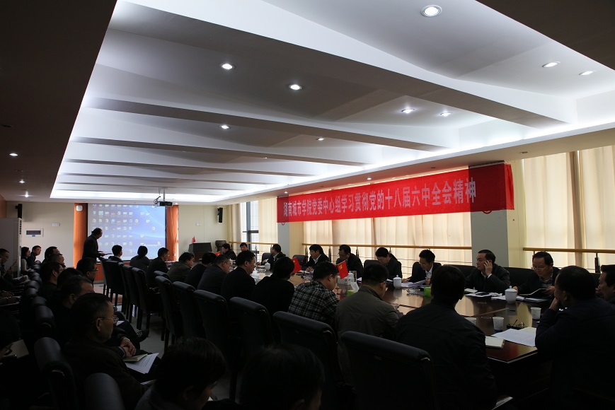 (本网讯)11月3日下午,学校党委中心组在办公楼三楼一会议室召开扩大会议,专题学习贯彻党的十八届六中全会精神。党委中心组成员,各二级学院总支书记、院长,机关处室正职参加会议。会议由党委书记罗成翼主持。