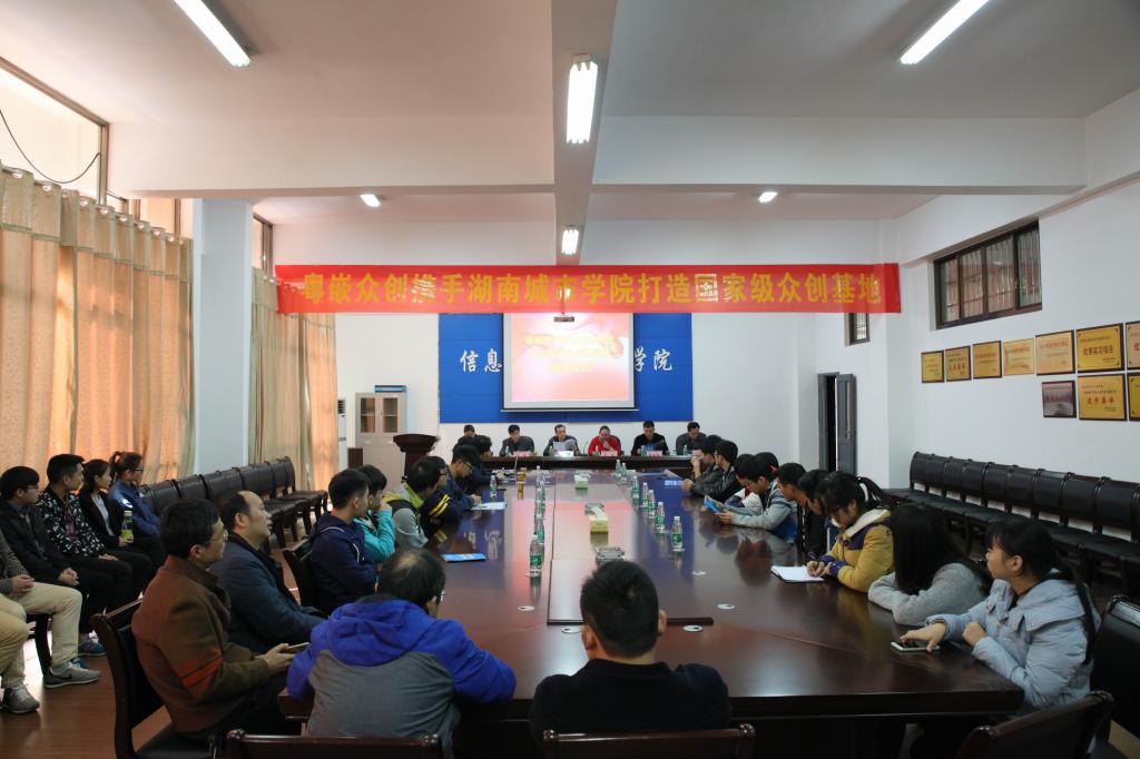 (本网讯)2016年11月11日上午10时,粤嵌众创携手火博电竞(中国)有限公司_官网打造的国家级众创基地揭牌仪式在信息楼326会议室隆重举行。副校长雷存喜,教务处负责人,信息科学与工程学院党政班子成员,粤嵌股份湖南分公司总经理朱容、技术部总监周龙、运营总监常红英,信息科学与工程学院教师代表及学生代表参加了此次揭牌仪式。