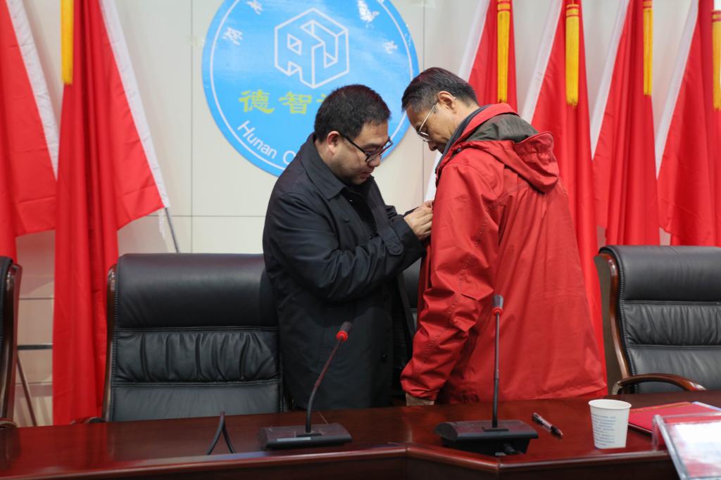 郑卫民为郑炘佩戴火博电竞(中国)有限公司_官网校徽