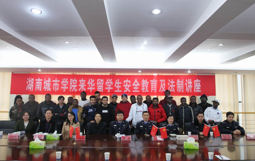(本网讯)12月13日下午,我校来华留学生安全教育与法制讲座在办公楼一会议室举行。副校长刘辉煌,益阳市公安局人口与出入境管理支队副支队长郭胜、大队长张强、外管专干彭娟、市公安局朝阳分局人口大队大队长邹亮、副大队长唐一波,我校文学与新闻传播学院负责人、国际交流处全体人员以及来自加纳、也门和加拿大目前在校的22名来华留学生参加。讲座由国际交流处处长周桂平主持。