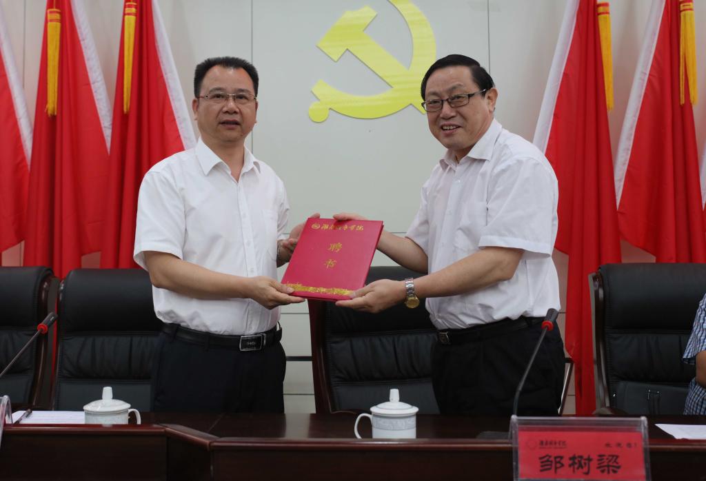 张福俭向我校授予“红旗出版社中国特色社会主义体系(益阳)研究中心”、“红旗书吧”牌匾,党委书记罗成翼和校长李建奇代表学校接牌。随后,张福俭向我校赠送以“学习习近平总书记系列重要讲话,为实现中华民族伟大复兴中国梦而奋斗”为主题的精品图书,李建奇代表学校向红旗出版社颁发捐赠证书,并聘任邹树梁教授为我校兼职教授。
