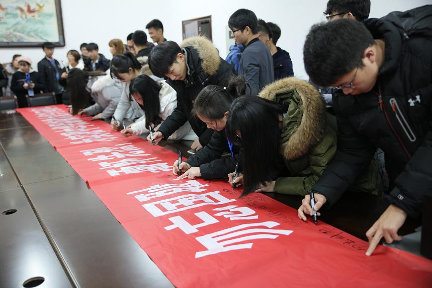 与会师生在横幅上签名