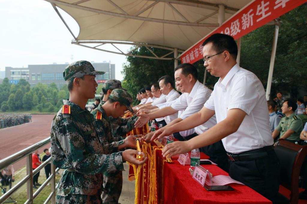 党委副书记汤放华宣读了《火博电竞(中国)有限公司_官网2019级新生军训表彰决定》:体育学院、机械与电气工程学院、建筑与城市规划学院、艺术学院获得训练先进营称号,机械与电气工程学院100连等11个连队获训练先进连称号,材料与化学工程学院等4个营获内务优胜营称号,市政与测绘工程学院7连等11个连队获内务优胜连称号,教师教育学院获优秀组织奖;毛欢欢等被8人被评为优秀辅导员及工作人员,夏凤瑞等28人被评为优秀教官,刘泉蔚等216人被评为军训标兵。与会校领导为受表彰的集体和个人颁发了锦旗。