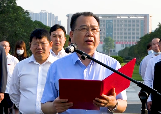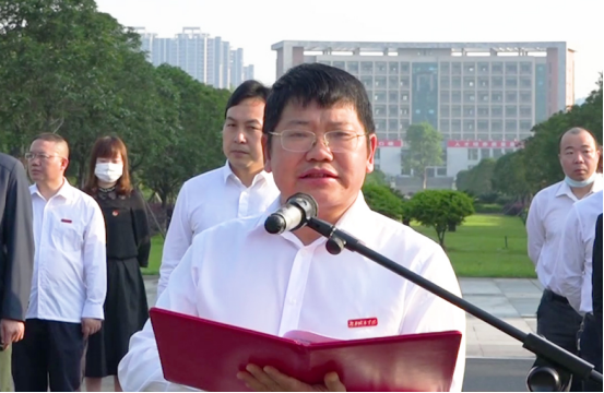 本网讯 2020年5月11日清晨,我校举行2020年春季学期返校复学后的首次升旗仪式。此次升旗仪式采用了“线上+线下”方式,全体校领导,相关处室负责人,二级学院党委书记、副书记、团委书记等参加现场升旗仪式,全体学生分别在宿舍或家中通过“云直播”的方式参加线上升旗仪式,共同感受这场特别的“开学礼”。校长李建奇主持升旗仪式。