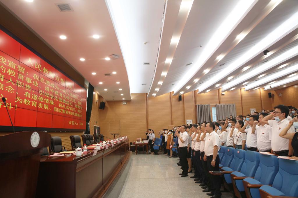 在雄壮的国歌声后,全体与会人员在李建奇的带领下庄严宣誓:我志愿成为一名人民教师,忠诚党的教育事业,遵守教育法律法规,履行教书育人职责,引领学生健康成长,做到有理想信念、有道德情操、有扎实学识、有仁爱之心,为教育发展、国家繁荣和民族振兴努力奋斗!