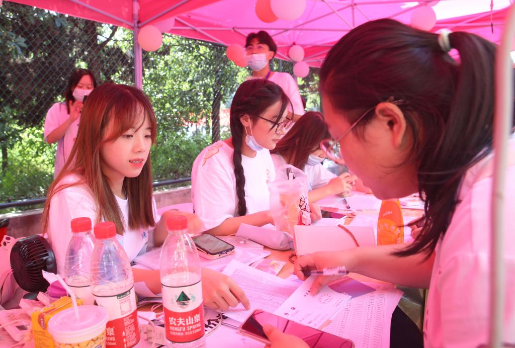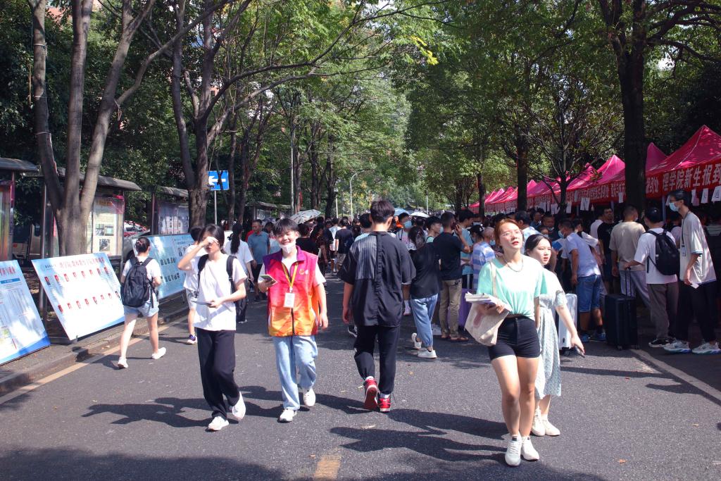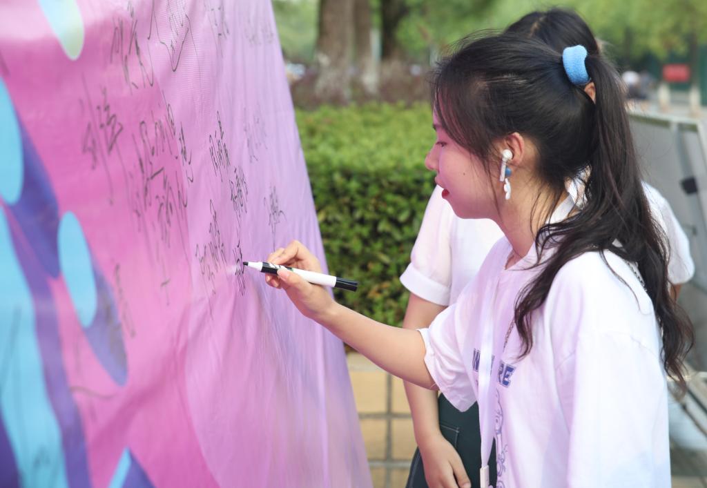 在第一食堂前面,学校为新生制作了一面大型的签名墙,引来了不少2021级学子们驻足,纷纷在上面写下了自己的名字,写下了他们对未来的憧憬与期许。“学校有来自五湖四海的同学,我希望能认识更多不同的朋友,与他们共同进步,实现自己的人生理想。”来自艺术学院环境设计专业的2021级新生陈力涵兴奋地说。