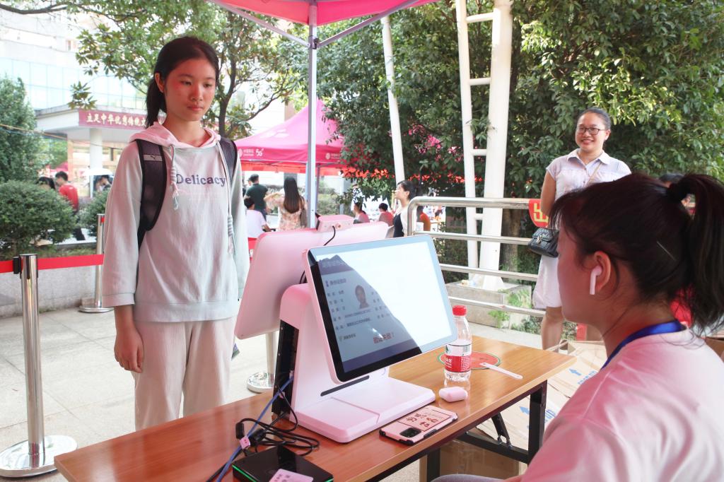 推进智能化迎新是今年学校迎新工作的一大亮点。在招生就业处报到处,相较于以往新生要提交录取通知书并扫描等相对繁琐的流程,今年的报到流程更为简化。新生只要出示本人身份证进行核验,然后根据要求进行人脸识别,不到十秒即可完成入校审核,极大提高了工作效率,更加快捷智能。同时,学校还在报到处正中央设立了一块电子显示屏,实时播报各学院报到人数。