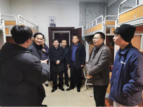 23121宿舍,袁志成嘘寒问暖,与留校的3位学生进行了亲切交谈。他仔细查看了学生寝室床被衣物与生活日常用品,仔细询问他们寒假期间的学习、住宿、饮食、活动情况和家庭疫情状况,得知他们衣食无忧、留校生活充实且丰富多彩后,感到由衷高兴。他嘱咐留校学生要提高防护意识,配合学校做好疫情防控工作,养成良好卫生习惯,积极开展健身运动,强健体魄,保持良好的身心状态,度过一个平安、祥和的假期和春节。袁志成语重心长地告诫学生,要科学合理安排假期学习生活,注重劳逸结合,按时作息,充分利用假期“加油充电”,为下学期专业学习打好基础。同时要多和家人联系沟通,遇到困难要及时向学校反映,学校会给予最大程度的支持与帮助,家校携手共克疫情。