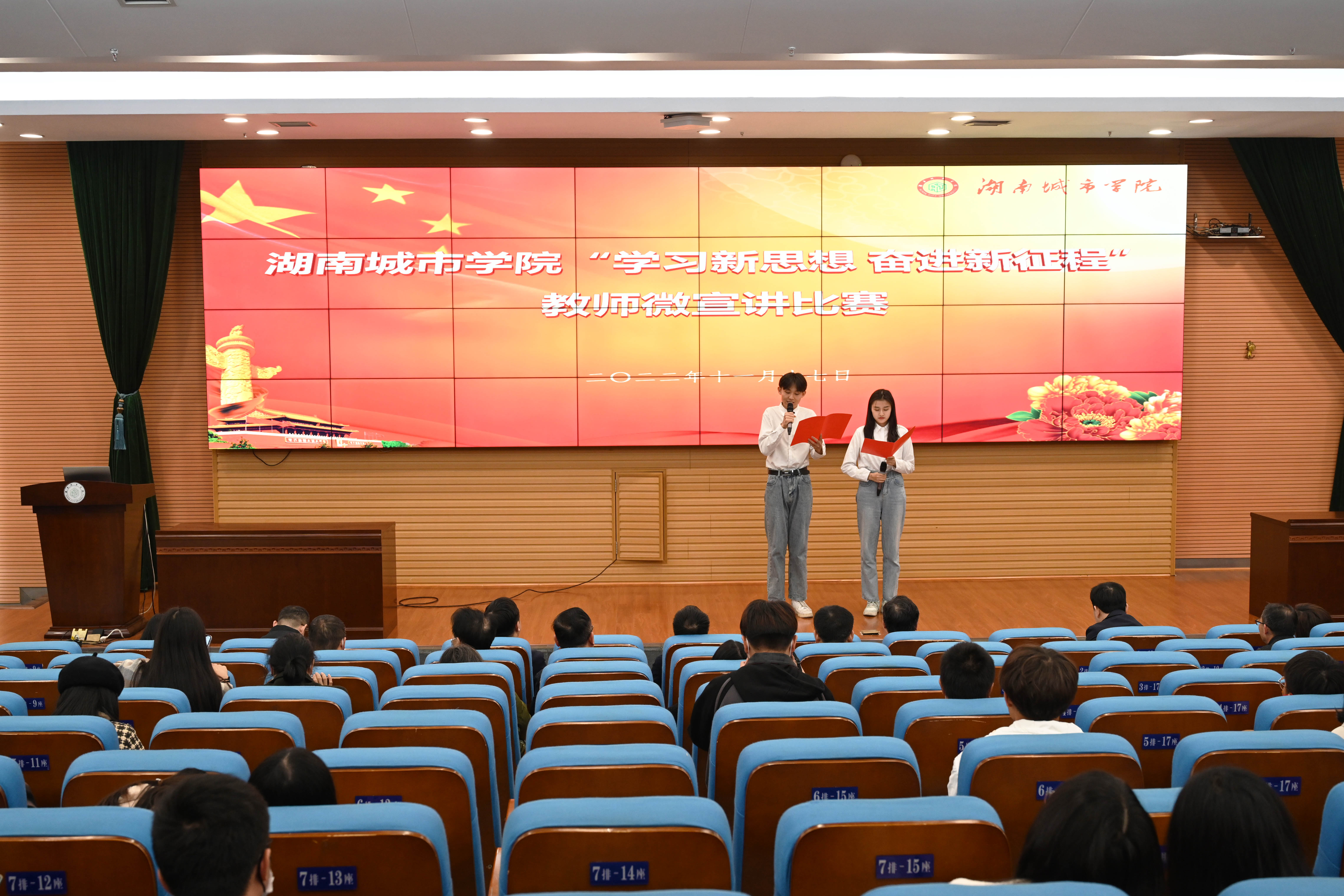 本网讯(通讯员 周文娟)“党的二十大开启了以中国式现代化全面推进中华民族伟大复兴的新征程,中国式的现代化需要现代化的人才做支撑……” 11月17日,火博电竞(中国)有限公司_官网“学习新思想,奋进新征程”教师微宣讲比赛在图书馆报告厅举行。来自各二级单位的18位参赛选手们围绕党的二十大报告,从党的二十大的历史地位与重大意义、党的二十大精神等方面,用“小故事”诠释“大道理”,将党的创新理论送到师生的心坎上。党委副书记何旭娟,副校长袁志成,党委委员、组织部部长吕贤军出席。