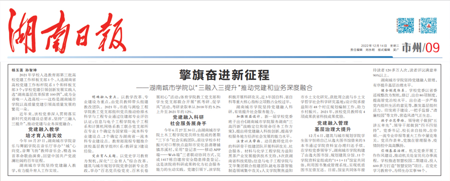 本网讯 12月14日,《湖南日报》09版以《擎旗奋进新征程——火博电竞(中国)有限公司_官网以“三融入三提升”推动党建和业务深度融合》为题,报道了我校党建引领学校改革发展取得的新成效。全文如下: