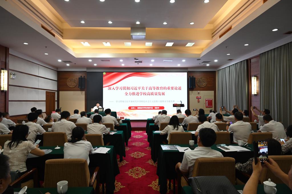 下午,全体成员在韶山宾馆会议室进行了“以学增智”专题学习研讨。汤放华以《深入学习贯彻习近平关于高等教育的重要论述 全力推进学校高质量发展》为题,为大家上了一堂深刻的党课。汤放华紧密结合当前高等教育新形势和学校发展新情况,通过详实的数据对比、丰富的案例讲解,从领会精神、再学习再思考习近平总书记关于教育重要论述,审时度势、切实增强教育强国的责任感使命感和紧迫感,狠抓落实、谱写新时代新征程火博电竞(中国)有限公司_官网高质量发展新篇章三个方面,阐述了学习贯彻习近平总书记关于教育的重要论述我们要做什么、怎么做的问题。