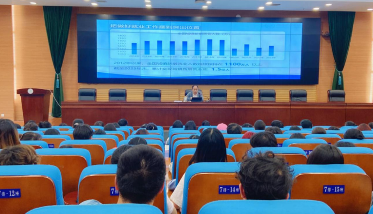 何振从“形势总体稳定”“就业压力仍存”“确保就业优先”“着力拓宽渠道”四个方面进行了阐述。他指出,就业是最基本的民生,国家全面落实就业优先战略,把稳就业提到战略高度统筹安排,着力实施就业民心工程,一系列就业创业政策对促进高校毕业生就业创业发挥了显著成效,犹如定海神针。他围绕学校就业举措和就业情况,分享了优秀校友的基层成长经历,鼓励学生明确方向、锚定目标,实现高质量就业,为职业生涯打下坚实基础。