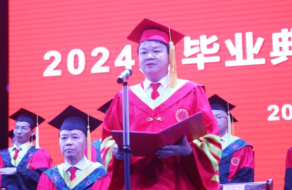 校党委书记汤放华主持毕业典礼,校长何振致辞,全体在家校领导,各二级学院书记和院长、各部门负责人、校友代表、毕业班辅导员齐聚一堂,共同见证毕业生的青春盛典。