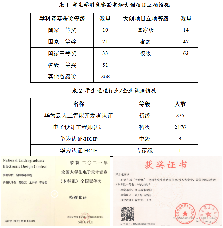 近年来,学校投入1200多万元新建了鸿蒙移动应用开发、人工智能等实验室,为学生提供宽敞舒适的实践环境。在校学生90%参与大创项目、学科竞赛和科研活动。毕业设计真题真做,校企共同指导。紧密对接行业需求,鼓励和支持学生参加行业企业认证考试。2017年,计算机科学与技术专业开设“新工科实验班”,在省内同类高校中率先开展新工科教育的改革与探索,逐步拓展到电子信息工程、通信工程、人工智能等专业。通过新工科建设,学生实践创新能力提升显著。近年来,学生累计获省级及以上学科竞赛奖励380多项,立项各级大学生创新项目120多项。人工智能专业学子在2024年英特尔杯全国大学生电子设计竞赛嵌入式系统专题邀请赛中获全国二等奖。通过华为云人工智能开发者认证、电子设计工程师认证、华为HCIP和HCIE认证的学生达2400多人。