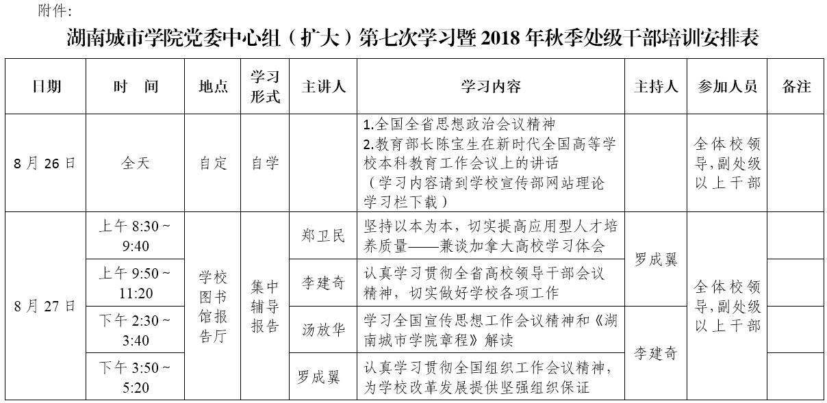 本次学习、培训采取辅导报告、个人自学的方式进行,具体安排见《火博电竞(中国)有限公司_官网党委中心组(扩大)第七次学习暨2018年秋季处级干部培训安排表》。