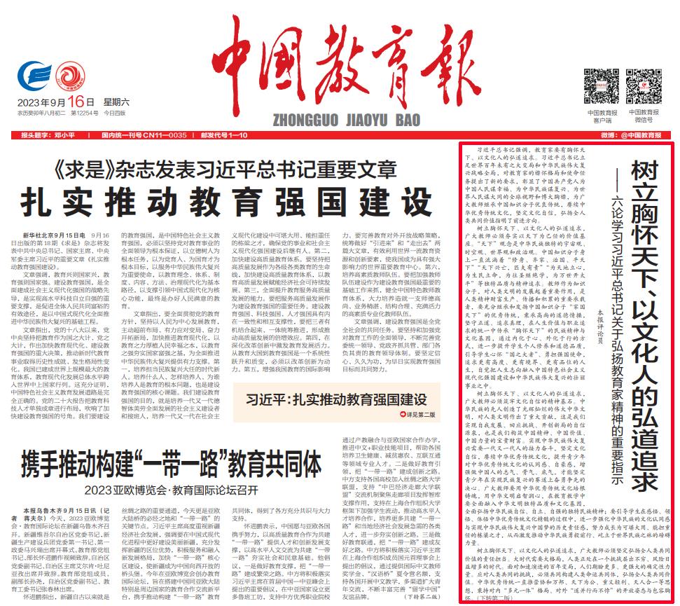 本网讯 9月16日,副校长袁志成在《中国教育报》头版发表评论员文章“树立胸怀天下、以文化人的弘道追求—— 六论学习习近平总书记关于弘扬教育家精神的重要指示”。全文如下: