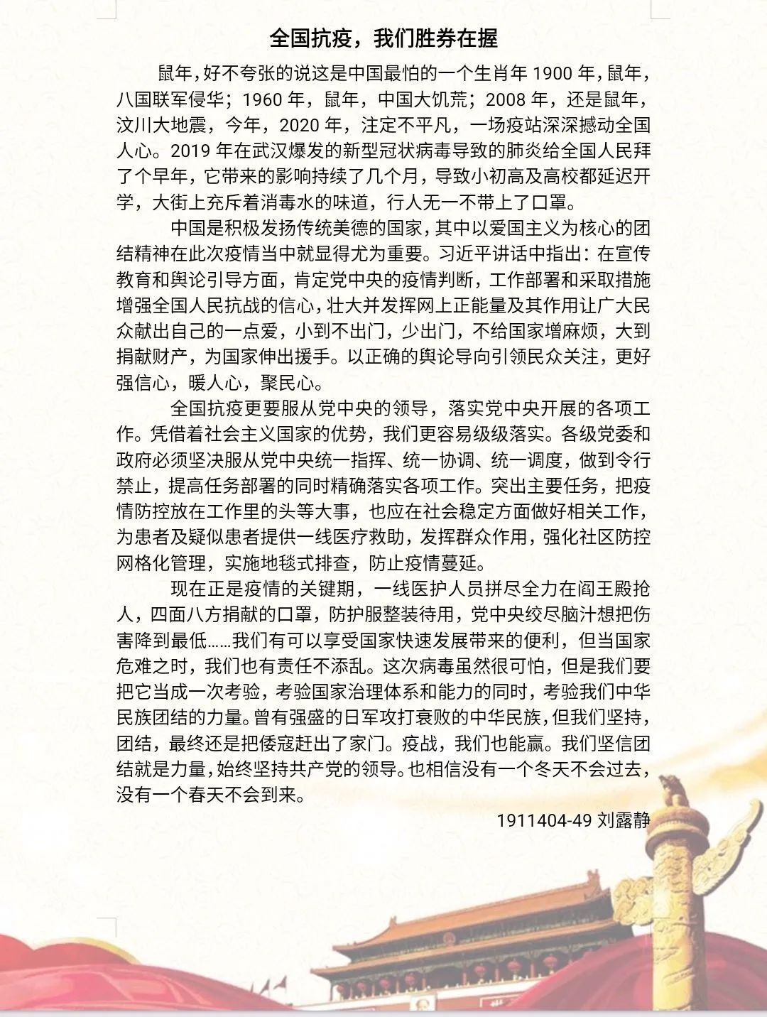 这场抗疫斗争体现了党和国家的高度重视,我院也一直积极配合党和国家的工作,尽全力将抗疫工作落实到位。我们始终坚持党和国家的正确领导,上下团结一致,共度难关。也请在前线的工作人员照顾好自己,我们等你们平安归来。